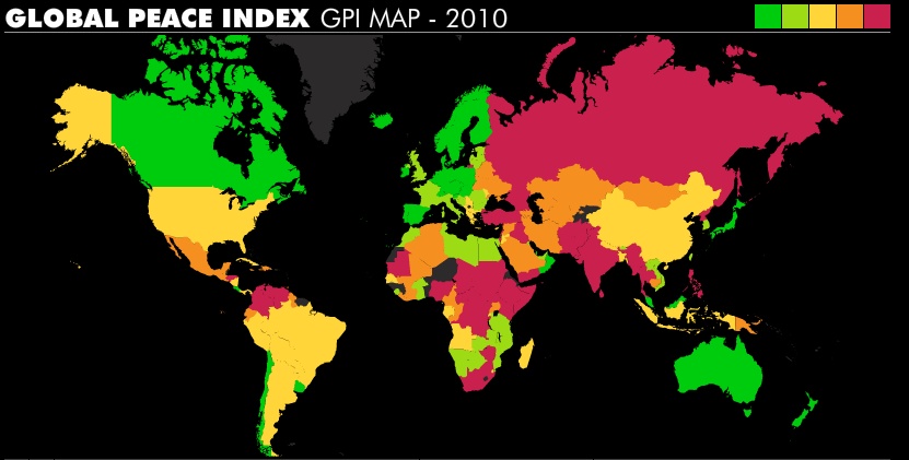 За цялата история на Световния индекс на мира, най-опасната страна в света е Ирак. Тази година след нея се нареждат Сомалия, Афганистан, Судан, Пакистан, Израел, Русия, Грузия, Чад и Демократична република Конго.